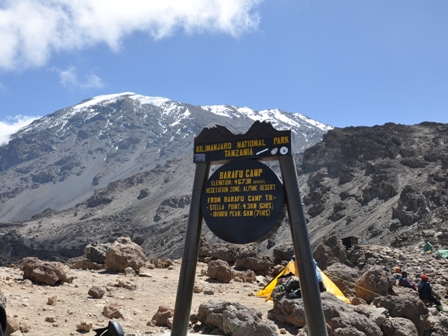 Day 5: Karanga Camp (4,035 m) – Barafu Camp (4,640 m). A short hop of around 3-4 hours, reaching Barafu camp around noon or 1pm, Offers a great view of the summit. The two peaks of Mawenzi and Kibo are visible from Barafu.